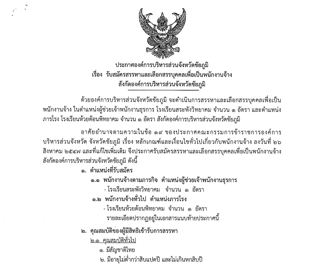 ประกาศองค์การบริหารส่วนจังหวัดชัยภูมิ เรื่อง รับสมัครสรรหาและเลือกสรรบุคคลเพื่อเป็นพนักงานจ้าง สังกัดองค์การบริหารส่วนจังหวัดชัยภูมิ