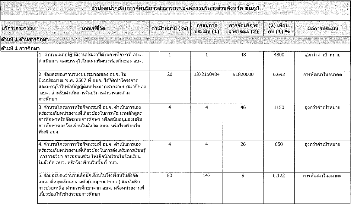 ผลการประเมินผลมาตรฐานขั้นต่ำการจัดบริการสาธารณะขององค์การบริหารส่วนจังหวัดชัยภูมิ ประจำปี พ.ศ. 2568
