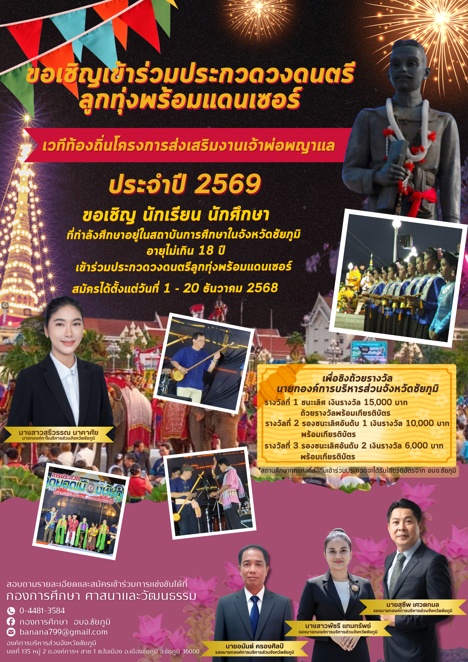 ขอเชิญร่วมประกวดวงดนตรีลูกทุ่งพร้อมแดนเชอร์ โครงการส่งเสริมงานเจ้าพ่อพญาแล ประจำปี 2568 ระวหว่างวันที่ 12-20 มกราคม 2568