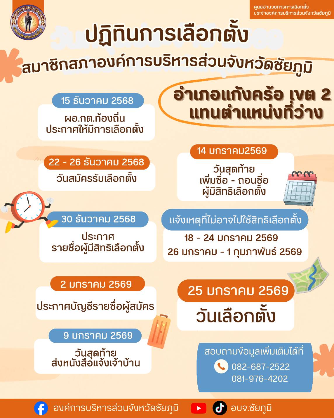 องค์การบริหารส่วนจังหวัดชัยภูมิ ประกาศรับสมัครผู้สนใจ สมัครสมาชิกสภา อบจ.ชัยภูมิ กรณีแทนตำแหน่งที่ว่าง เขตเลือกต้ังที่ 2 อ.แก้งคร้อ จ.ชัยภูมิ ระหว่างวันที่ 22 - 26 ธันวาคม 2568 เวลา 08.30 - 16.30 น