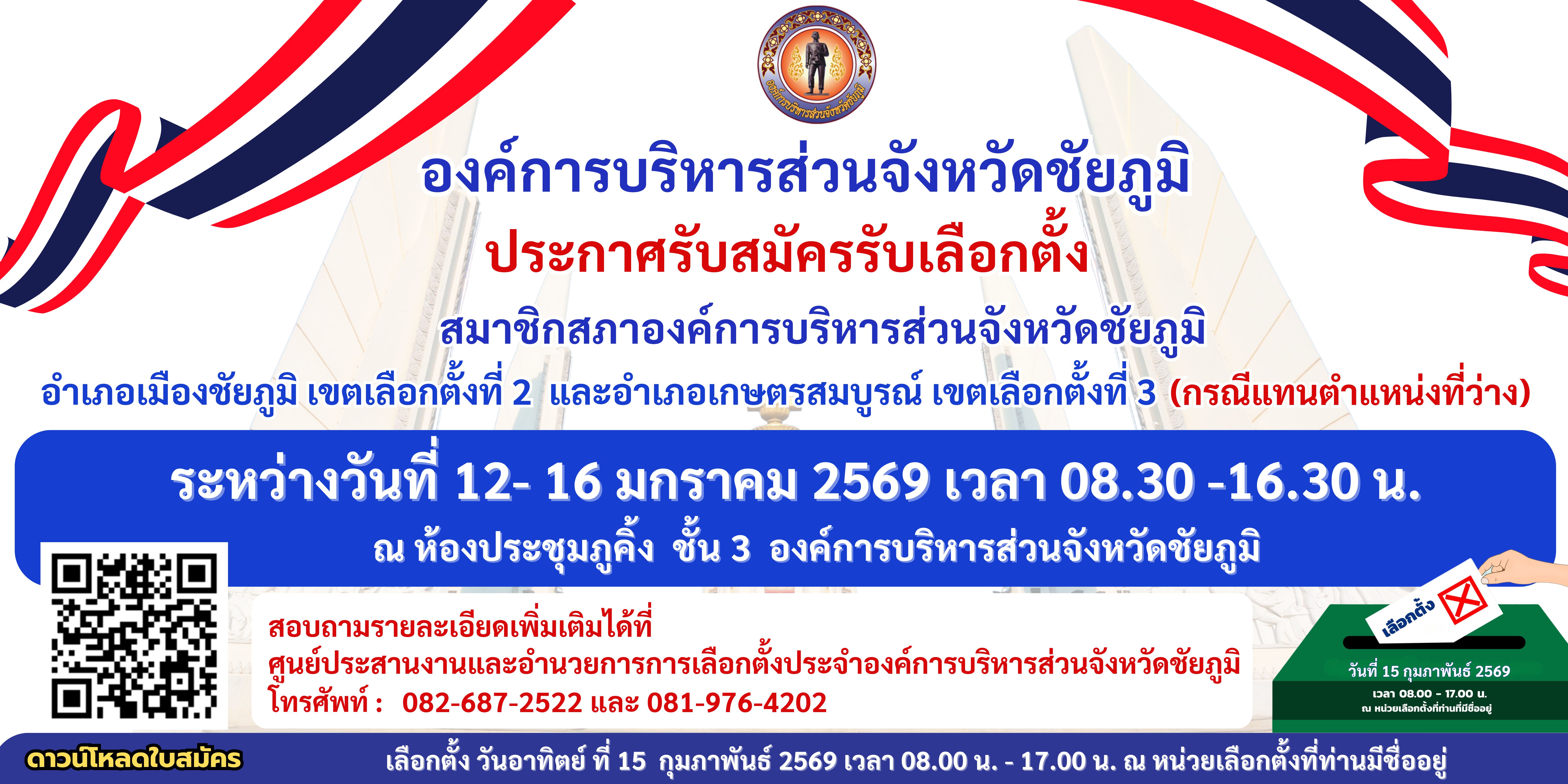 องค์การบริหารส่วนจังหวัดชัยภูมิ ประกาศรับสมัครรับเลือกตั้ง สมัครสมาชิกสภาองค์การบริหารส่วนจังหวัดชัยภูมิ อำเภอเมืองชัยภูมิ เขตเลือกตั้งที่ 2 และอำเภอเกษตรสมบูรณ์ เขตเลือกตั้งที่ 3