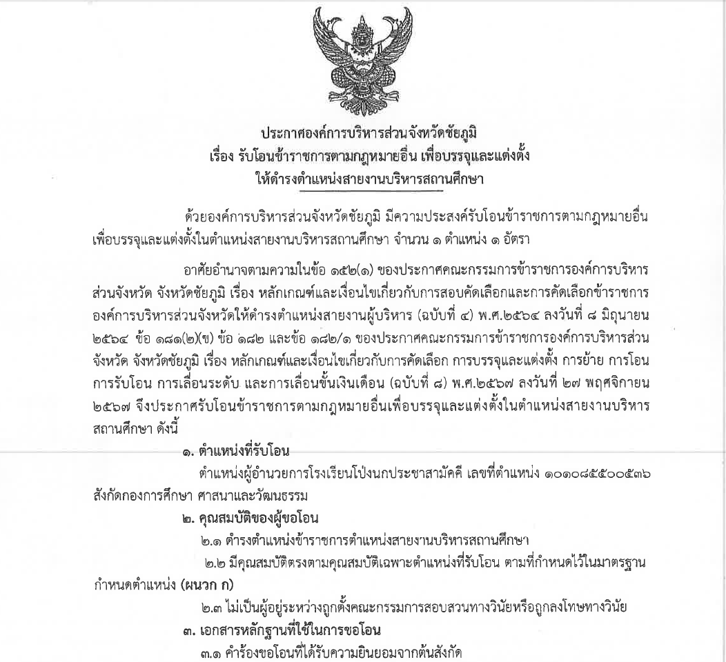 เรื่อง รับโอนข้าราชการตามกฏหมายอื่น เพื่อบรรจุและแต่งตั้งให้ดำรงตำแหน่งสายงานผู้บริหารสถานศึกษา