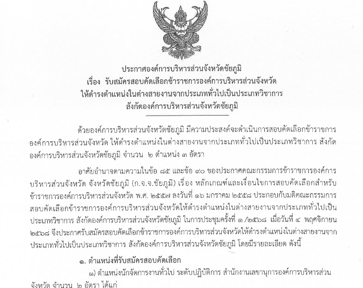 เรื่อง รับสมัครสอบคัดเลือกข้าราชการองค์การบริหารส่วนจังหวัด ให้ดำรงตำแหน่งในต่างสายงานจากประเภททั่วไปเป็นประเภทวิชาการ สังกัดองค์การบริหารส่วนจังหวัดชัยภูมิ