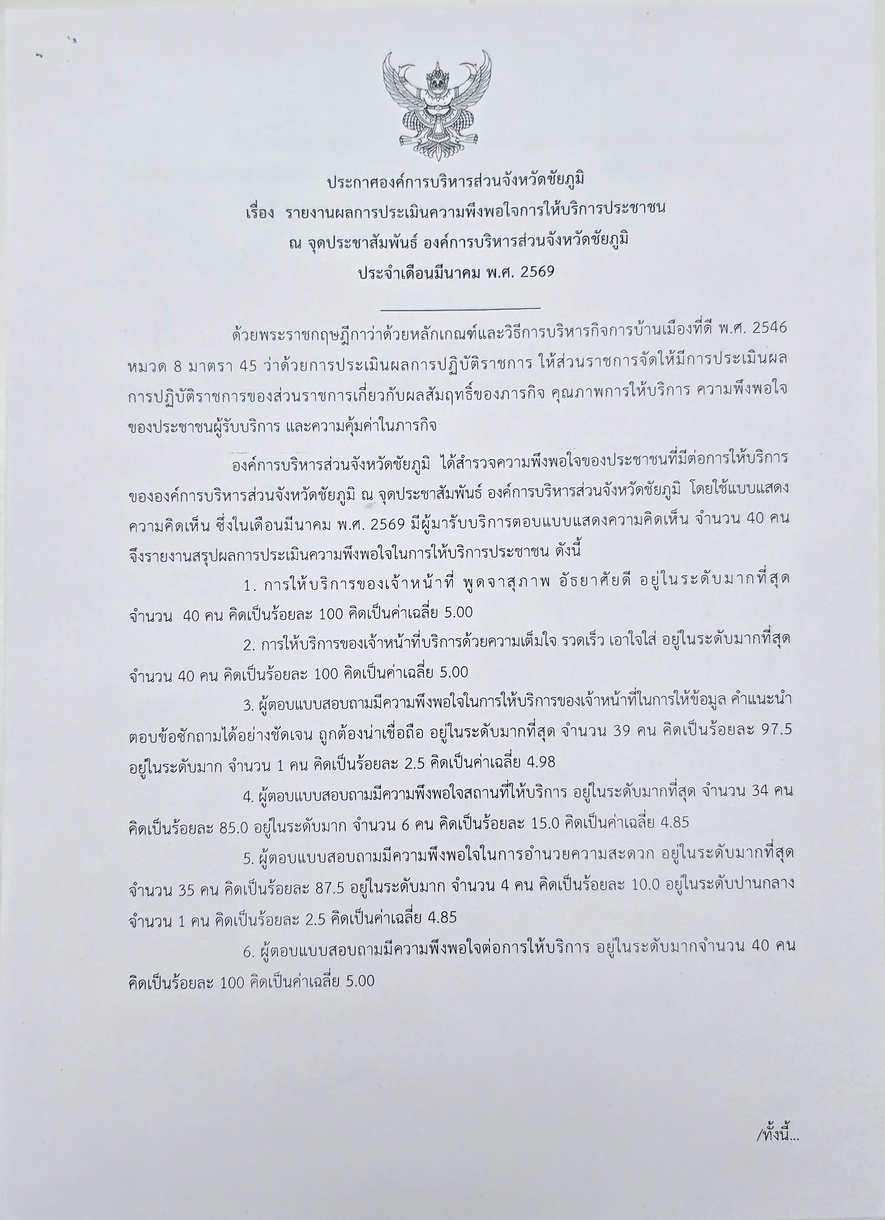 รายงานผลการประเมินความพึงพอใจการให้บริการประชาชน ณ จุดเคาน์เตอร์ประชาสัมพันธ์ องค์การบริหารส่วนจังหวัดชัยภูมิ ประจำเดือนมีนาคม พ.ศ. 2569