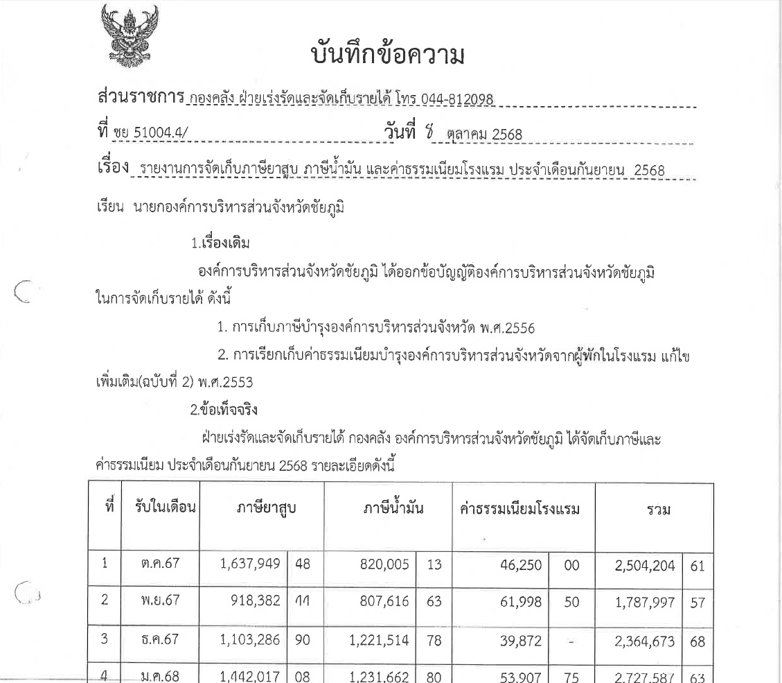 รายงานการจัดเก็บภาษียาสูบ ภาษีน้ำมัน และค่าธรรมเนียมโรงแรม ประจำเดือนกันยายน 2569