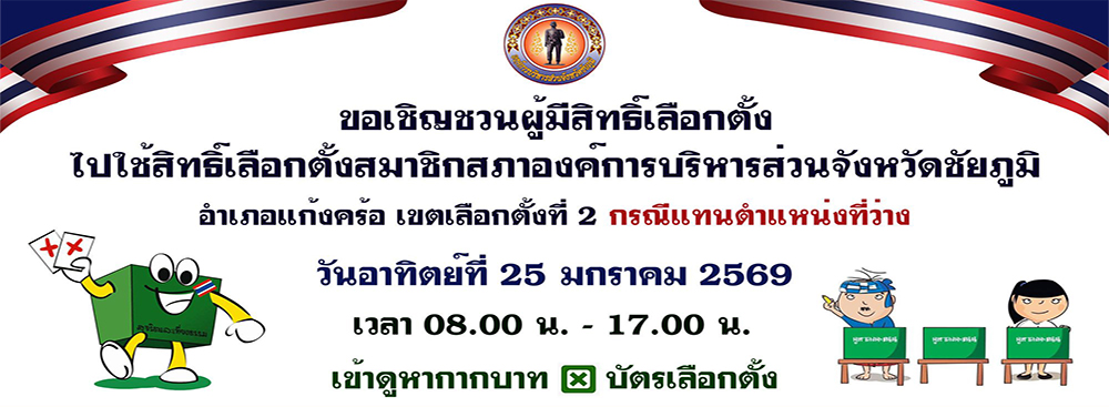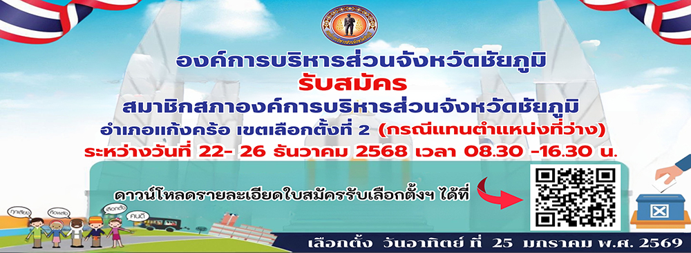 องค์การบริหารส่วนจังหวัดชัยภูมิ ประกาศรับสมัครผู้สนใจ สมัครสมาชิกสภา อบจ.ชัยภูมิ กรณีแทนตำแหน่งที่ว่าง เขตเลือกต้ังที่ 2 อ.แก้งคร้อ จ.ชัยภูมิ ระหว่างวันที่ 22 - 26 ธันวาคม 2568 เวลา 08.30 - 16.30 น